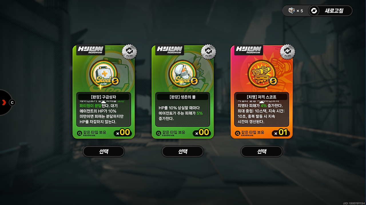 특히 스테이지 종료마다 좋은 카드를 주는 선택 구간이 있는데, 우측 상단의 [새로고침]을 충분히 활용해 나에게 필요한 카드를 선택하는 것이 중요합니다. 만약 조합까지 가능한 카드라면 베스트겠죠.