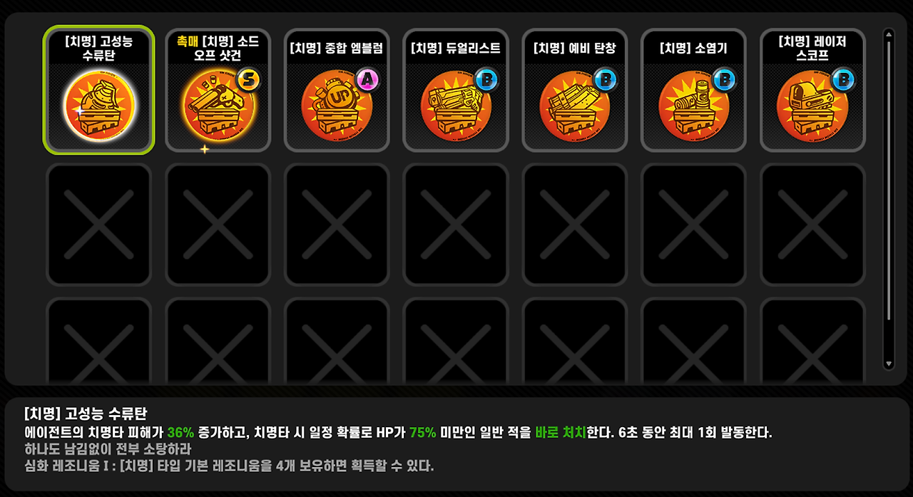 그리고 치명타입의 레조니움 4개를 모으면 잔 몹의 HP가 75% 미만일 때 바로 처치해주기 때문에