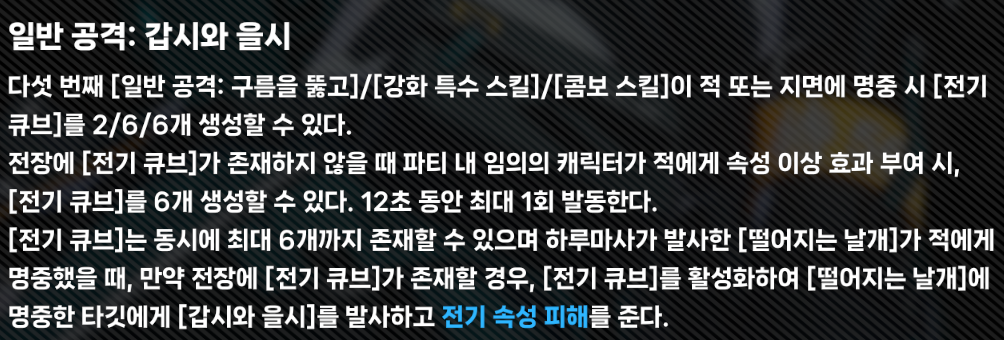 [강화 특수 스킬 or 평타 or 콤보 스킬로 전기 큐브 생성 6개 까지] - [강공격 홀드 스킬로 전기 큐브를 활성화 하여 전기 속성 피해 추가] 두 가지만 신경쓰면 되는 아주 간단한 사이클을 갖고 있는 하루마사