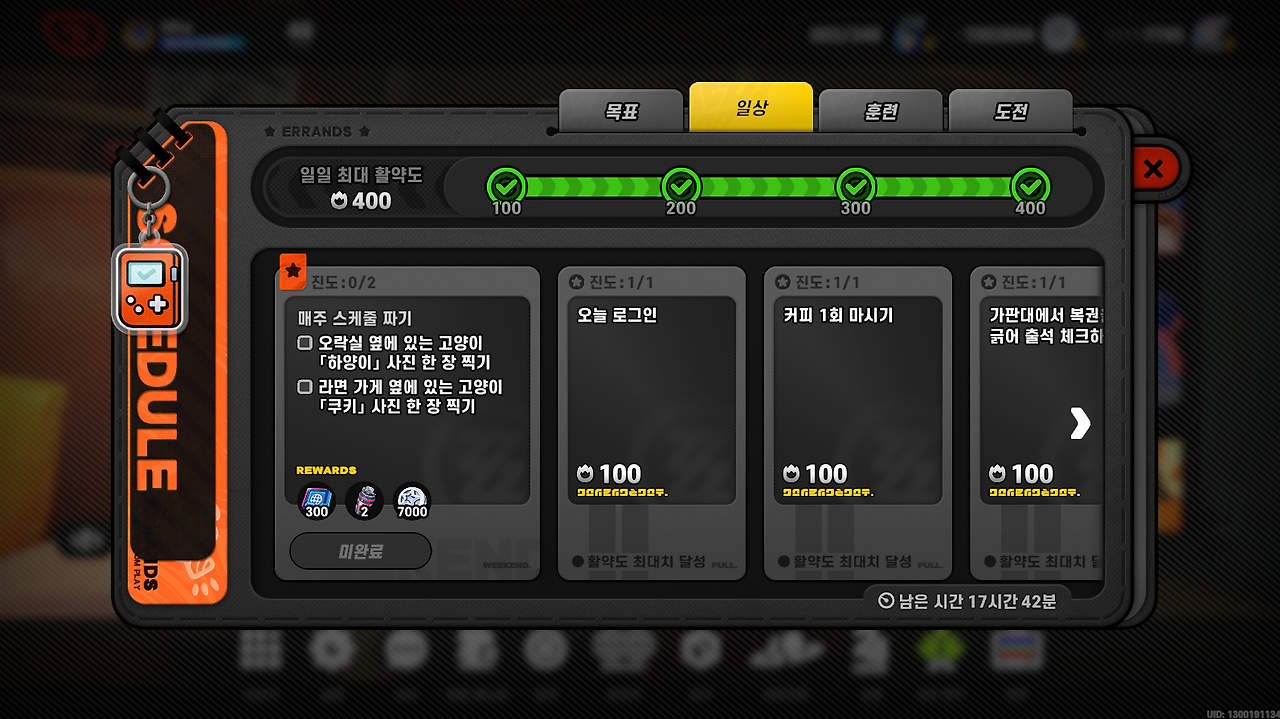 일일/주간 컨텐츠 루프가 정리된 UI입니다.