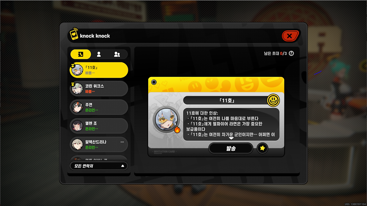 좌측 리스트에서 에이전트 선택 후 [발송] 버튼 선택 시 호감도 퀘스트가 활성화됩니다.
