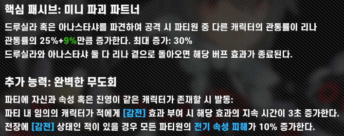 B 잔향-Ⅱ형 에너지 자동 회복 [강화 특수 스킬] 혹은 [콤보 스킬] 시전 시 모든 파티원의 이상 장악력과 이상 마스터리가 10pt-16pt 증가 지속 시간: 10초, 20초 동안 최대 1회 발동하며 이름이 같은 패시브 효과끼리 중첩되지 않음 변조, 장난감 가게 |