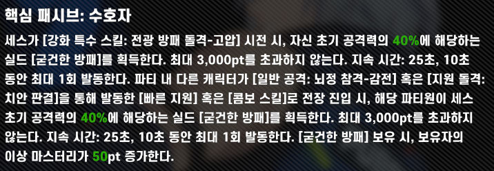 A 평화 수호자 특화형 공격력 쉴드 보유 시 착용자 에너지 자동 회복, 강화 특수 스킬 및 지원 돌격으로 누적하는 속성 이상 축척치가 36% 증가 변조 |