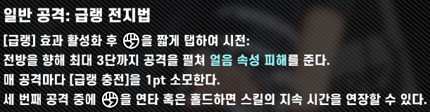 그로기 돌입 전 가능한 급랭을 모으고 콤보에 돌입하여야 효율적인 딜 사이클을 만들 수 있는 딜러입니다.