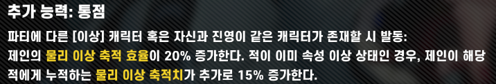 대부분의 에이전트와 마찬가지로 제인도 역시 반드시 파티 내 동일 진영 혹은 동일 속성의 에이전트가 반드시 필요합니다.